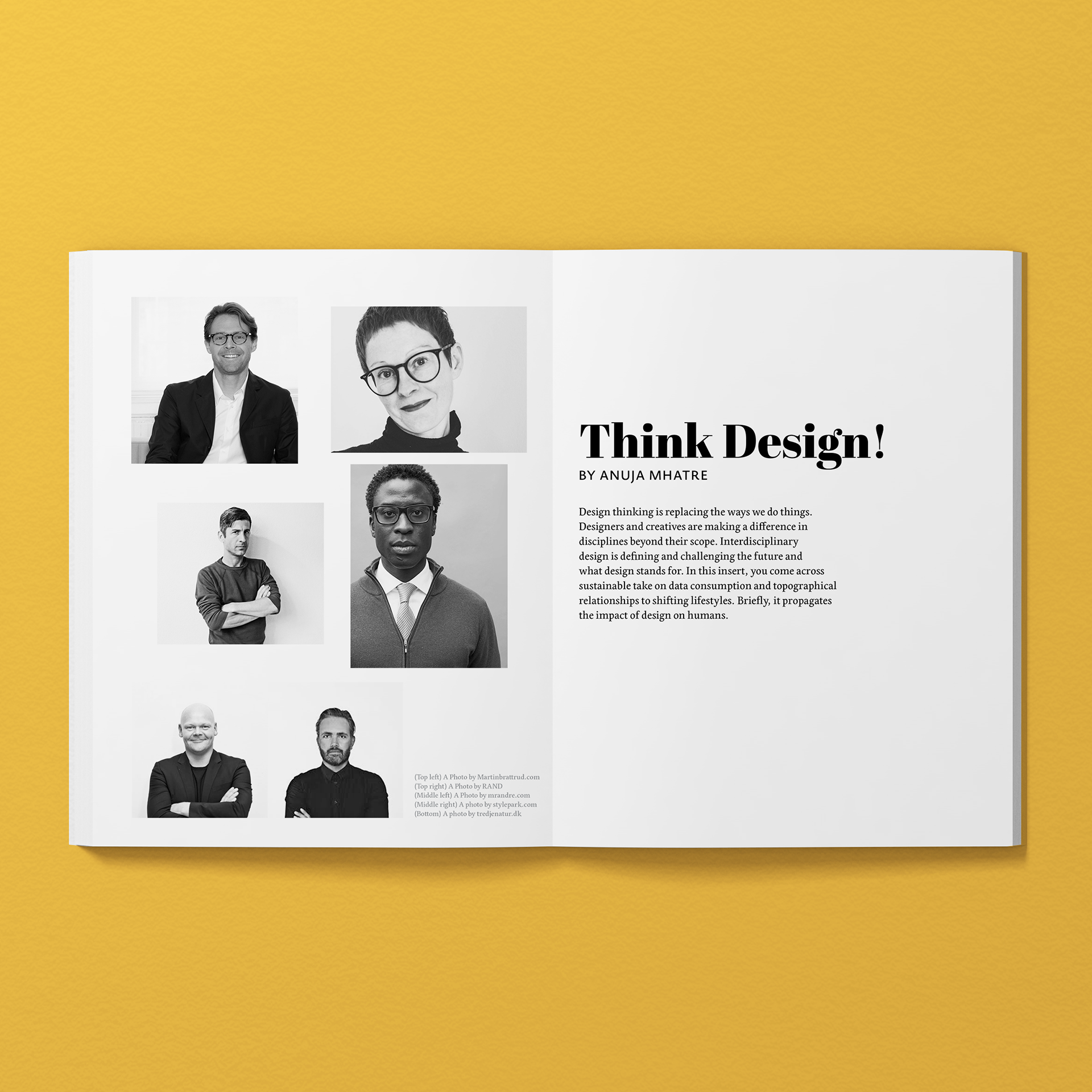 Think Design! is a magazine insert that promotes sustainable multidisciplinary projects. The content comprises of researched data about real-life designers.
